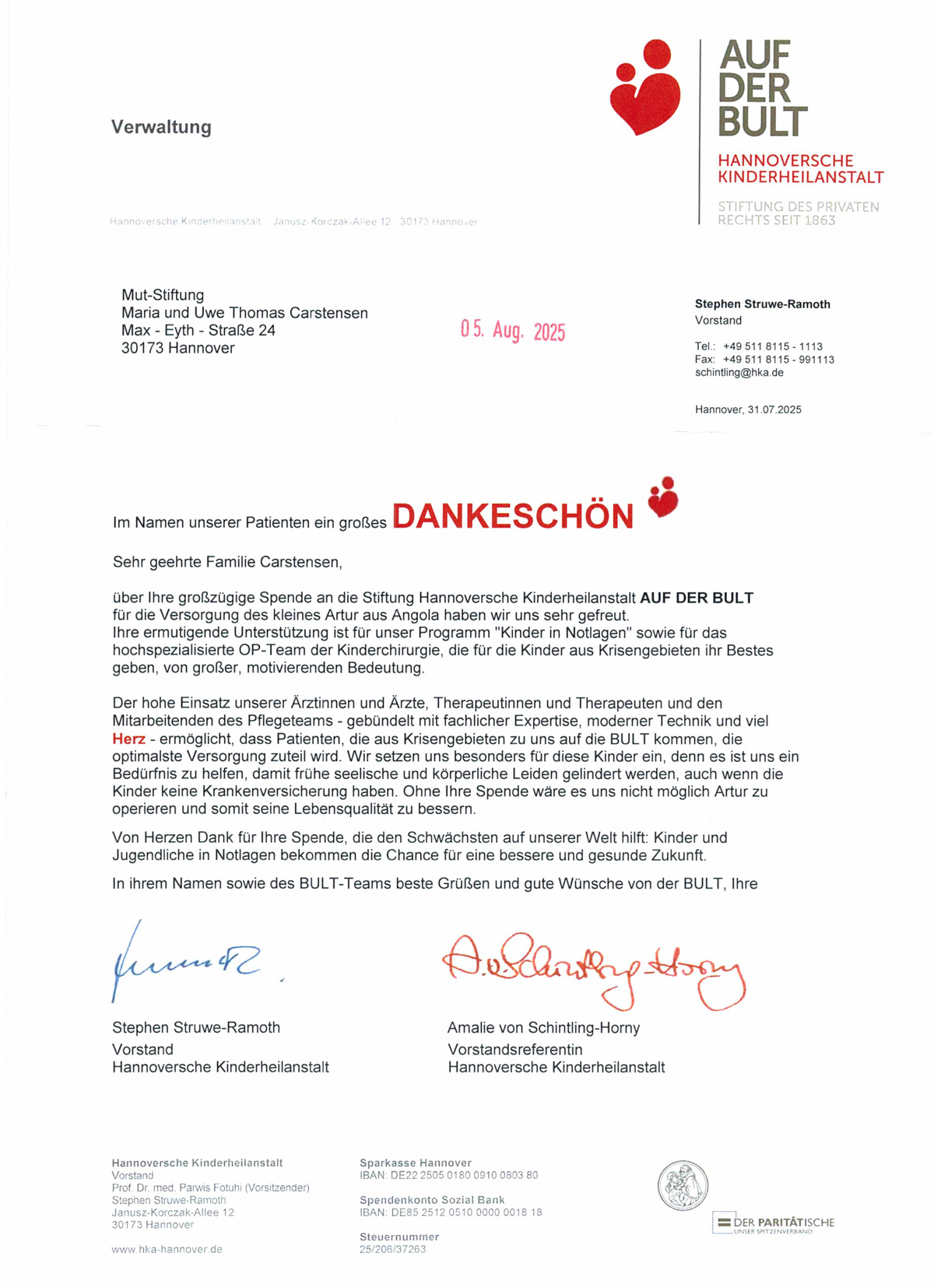 Spendenkonto – IBAN: DE98 2508 0020 0101 2940 00 – Kontoinhaber:  MUT-Stiftung