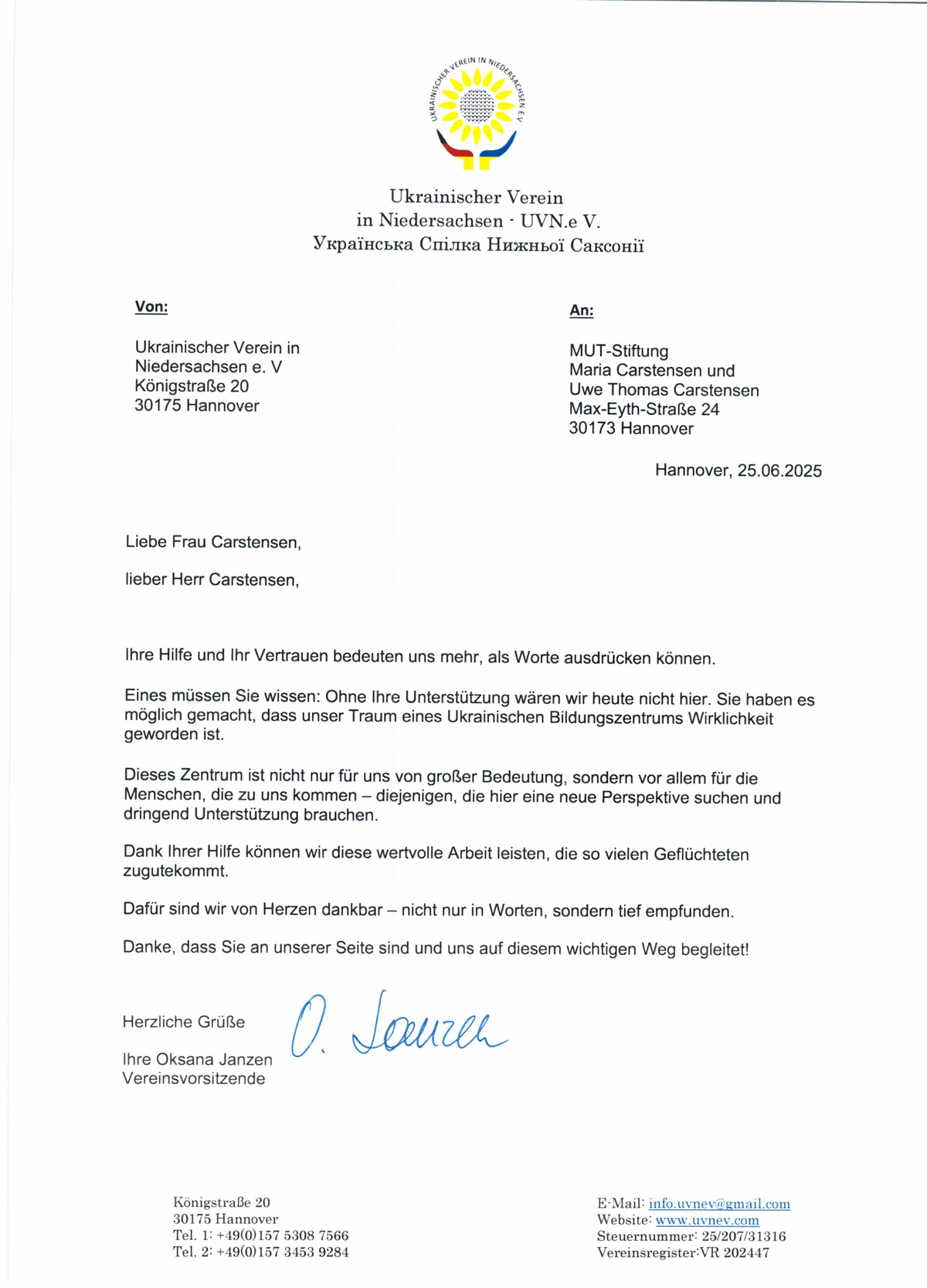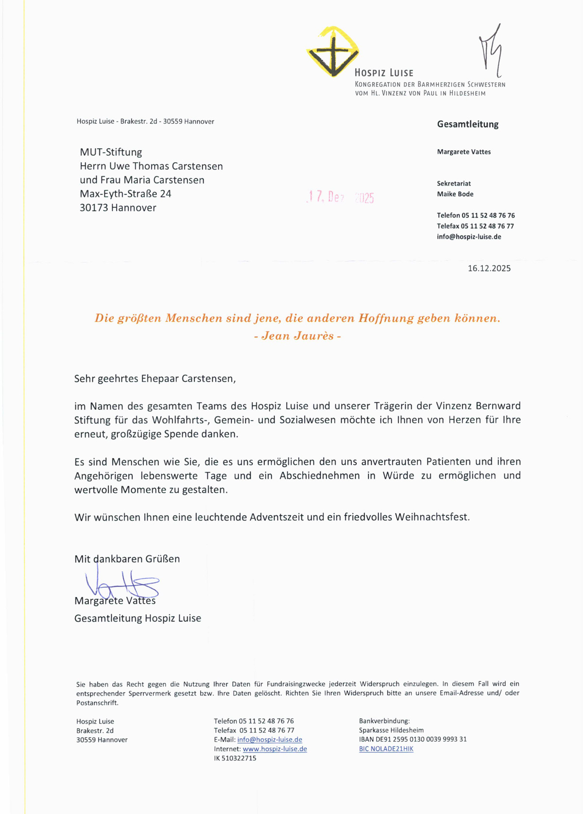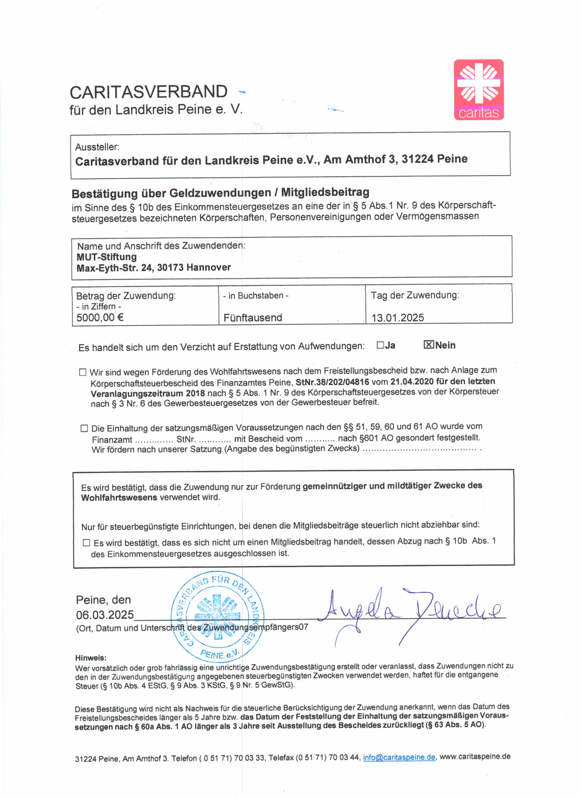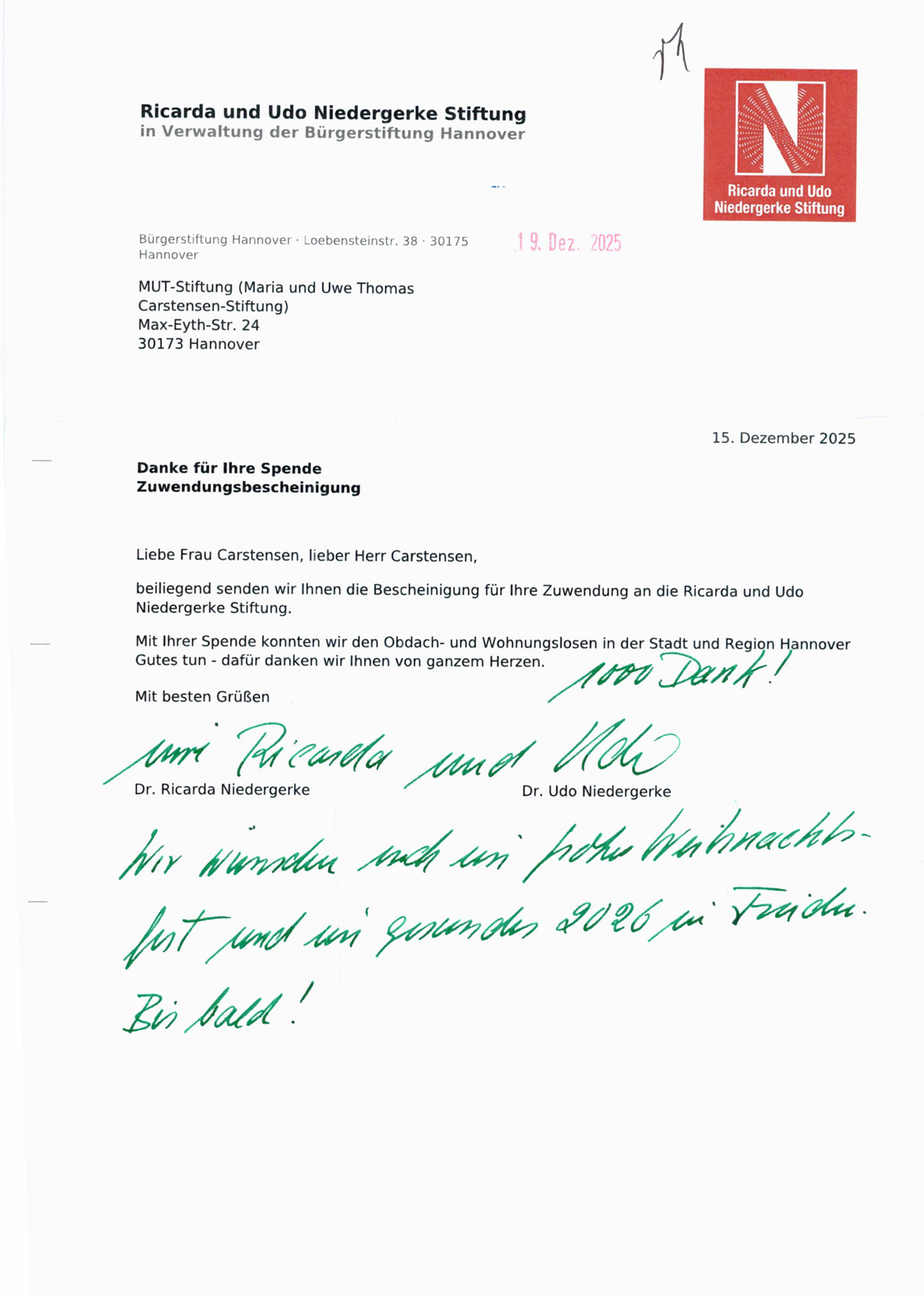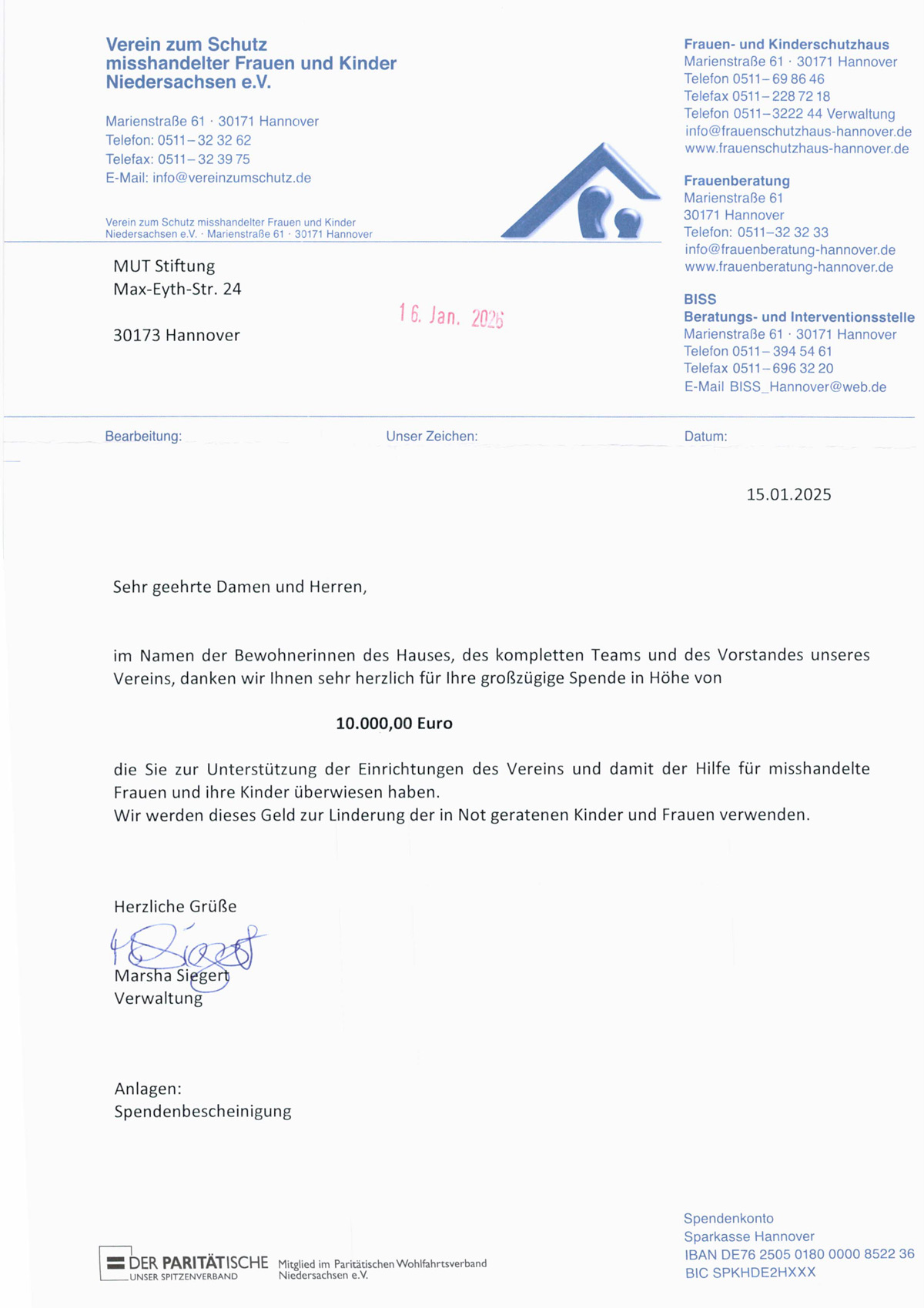 Spendenkonto – IBAN: DE98 2508 0020 0101 2940 00 – Kontoinhaber: MUT-Stiftung