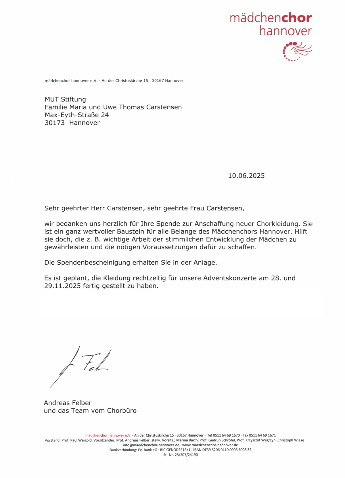 Auch ohne „Not“: wir helfen bei der gesellschaftlich wichtigen Arbeit mit Kindern und Jugendlichen: z.B. dem Mädchenchor Hannover.